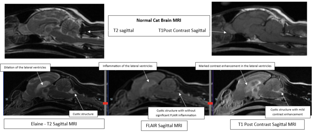 An MRI was then performed which revealed several abnormalities including meningitis, ventricular inflammation (ependymitis), encephalitis, moderate hydrocephalus, and bilateral anterior uveitis. The primary differential for all of Elaine’s kidney, brain, and eye changes was feline infectious peritonitis (FIP). There was also a small area of CSF fluid accumulation along the caudal fossa without significant mass effect which was suspected to be an incidental arachnoid cyst. Given the likelihood of FIP, BOVA (GS-441524) as well as clindamycin while awaiting pending test results.