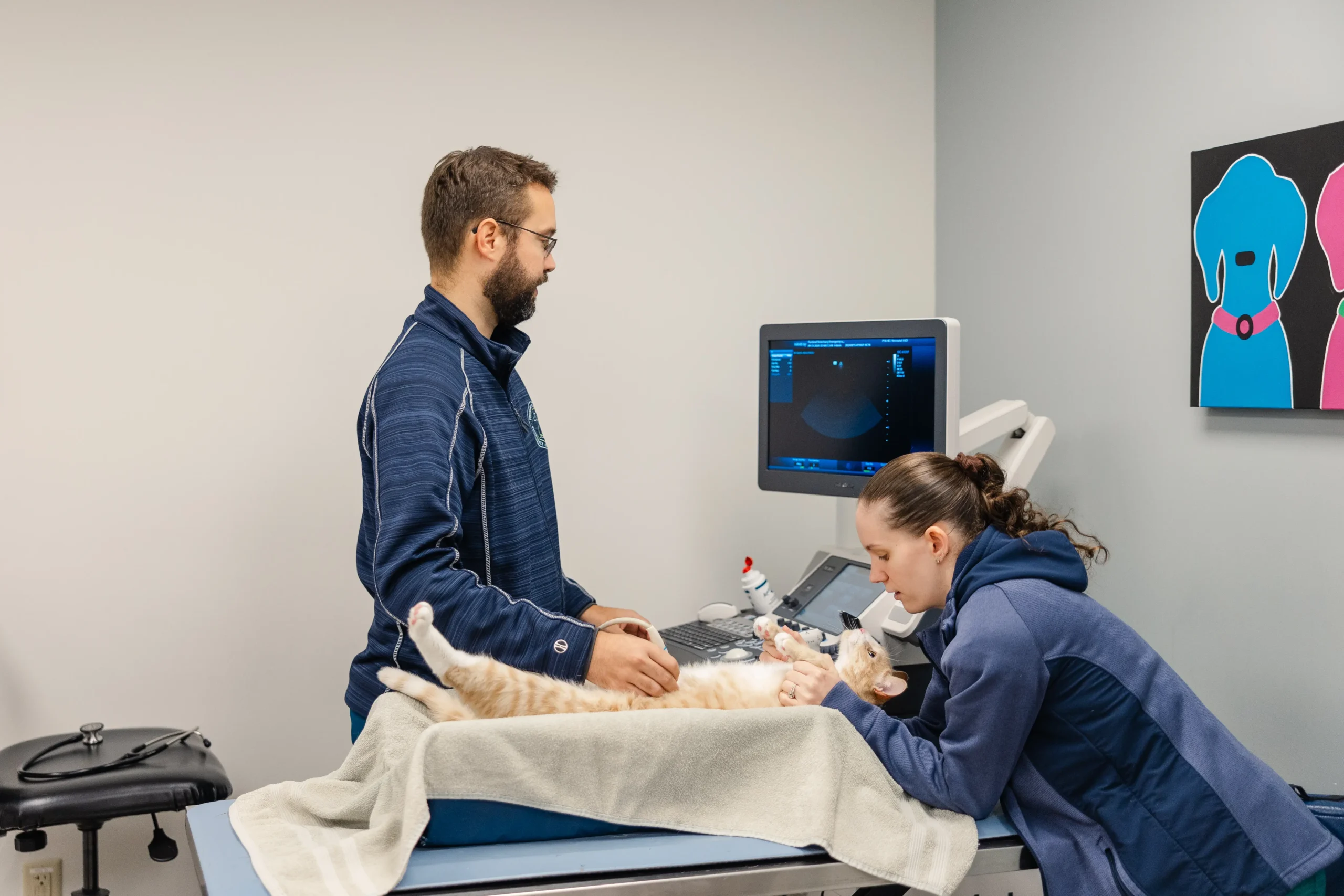 At Portland Veterinary Emergency and Specialty Care our radiology and imaging center includes digital radiography, multiple ultrasounds for various applications, Vimago GT30 CT Scanner, and GE 1.5 Tesla MRI. We also provide fluoroscopy and interventional radiology. Our board-certified internal medicine specialists provide medical consultation with ultrasound Monday through Friday. All specialty visits require an appointment. Ultrasound is available through our emergency department on weekends for true emergency cases.