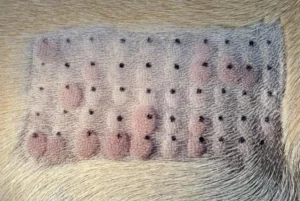 The intradermal allergy testing, also known as a skin patch test, is considered the “gold standard” method due to its potential for fewer false positives and its comprehensive nature. The disadvantages include the need for sedation and the requirement to discontinue certain drugs, such as antihistamines and steroids, prior to testing. For skin patch testing, light sedation is used, and the coat is clipped on one side of the chest minimizing any cosmetic impact on the coat. Northeast regional allergens (pollens, molds, house dust mites, etc) are injected into the skin with tiny needles, and the area is observed for inflamed, red skin—indicating an allergic response—within 20 minutes. Based on these results, a customized allergen immunotherapy serum is created, which can be administered as weekly to bi-weekly injections or daily oral drops.