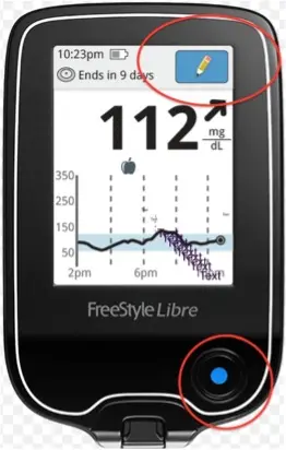 Add Notes -touch the pencil symbol in the upper right corner of the touchscreen. Select the checkbox next to the notes you would like to add (e.g. long-acting insulin, or food). After you check the box for food and insulin notes, the