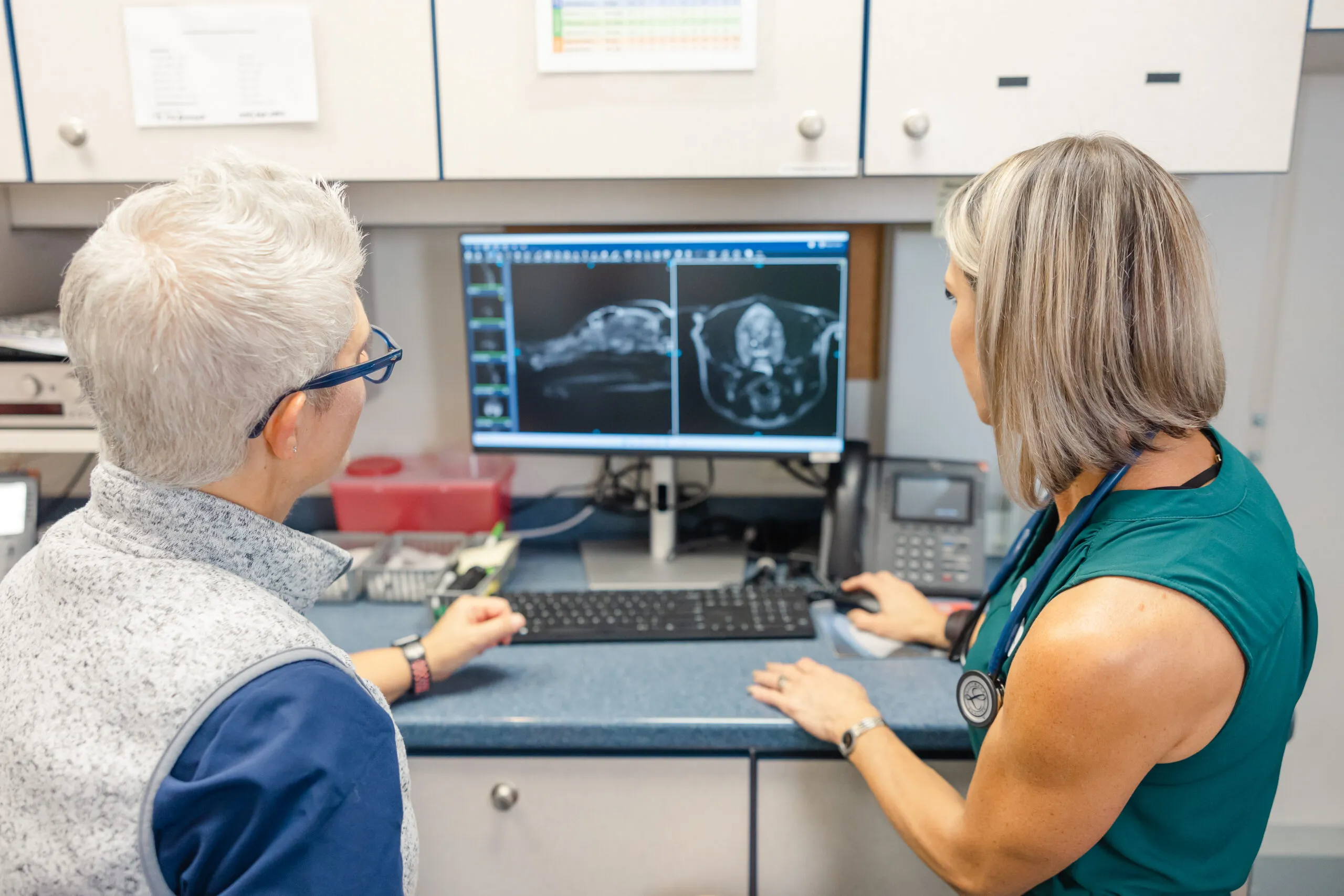 At Portland Veterinary Emergency and Specialty Care our radiology and imaging center includes digital radiography, multiple ultrasounds for various applications, Vimago GT30 CT Scanner, and GE 1.5 Tesla MRI. We also provide fluoroscopy and interventional radiology. Our board-certified internal medicine specialists provide medical consultation with ultrasound Monday through Friday.  All specialty visits require an appointment.  Ultrasound is available through our emergency department on weekends for true emergency cases.